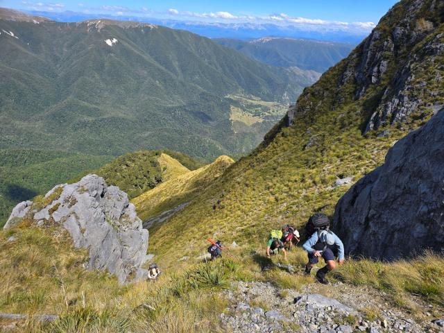 NTC trampers climbing Sunrise Ridge, Kahurangi NP