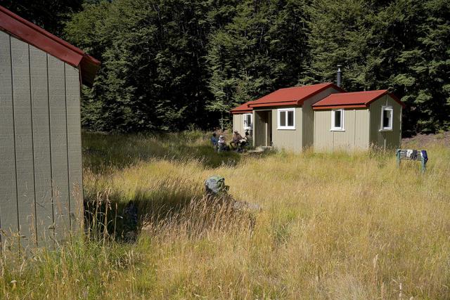 Returning to the hut, we set off on a pleasant track through beautiful beech forest, the residence of a thousand wasps. A gradual climb to a bush saddle then dropped steadily into Jollie Brook, sidling a few slips, splashing across the stream. A swingbridge was crossed to reach the seven-berth hut, an unusual design sporting two bunkrooms separated by a large kitchen. Jollie Brook Hut was in excellent condition and we enjoyed our sojourn there.