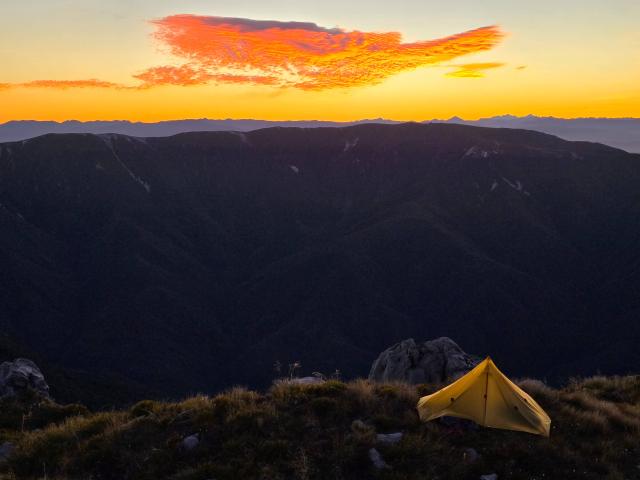 with 6.5l and had 2.75l left by the time we left the next morning. I drank two bottles on the way up, it being a very hot day. Soon after arriving at the summit of Sunrise Peak at about 4pm we were entertained by a pair of kea and then we were given a light show by the dipping sun with extensive views to the Marlborough Sounds, Inland Kaikoura, Nelson Lakes and down the West Coast.