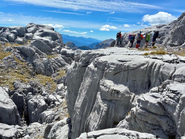The sunrise was at 6.30am and it dawned a brilliant day. The night had been a disturbed one for most due to a combination of wind, flapping tents and sloping ground. Added to this for Heidi was a deflated mattress due to Spaniards and an unsuccessful repair (how many holes are there?!). So, a change of plan was needed, and we decided to head for the Granity Pass hut where the mattresses are as hard as! We set off at 8 in a northerly direction following a In the middle of the maze cairned route (the poles stopped at Sunrise). I had done this before so knew what we needed to do but we went a bit wrong by following the wrong cairns through a natural rock arch and into a labyrinth of limestone crevasses that eventually barred the route. A retrace back under the arch (more photo ops) and we were on the right track again. For future reference go as far north as you can following the ramparts guarding the southern slopes of Mt Owen before turning sharp west to follow a distinct grassy hollow rising to the SW corner of Mt Owen.