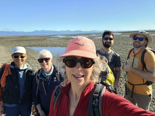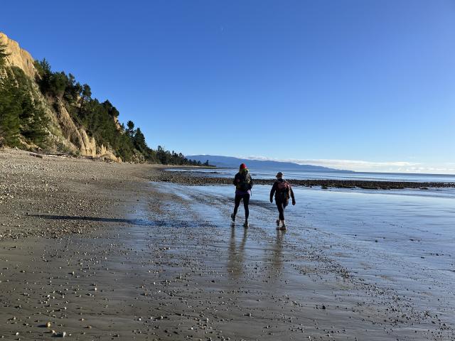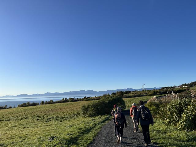 Five of us met in Richmond and drove out to Deck Road, above Kina beach. From the car park at the end of Deck Road we went down a link track to the beach and walked along the coastline below towering cliffs of conglomerate.The day was glorious, sunny and no wind. We had beautiful views across to the Richmond Ranges, D’Urville Island and Abel Tasman in the west. From our lunch spot we waved to the other NTC group who were on Mt Duppa! We walked to the end of the Peninsula, then back along the beach to the campground where we left the beach to walk back along Cliff Road past enormous houses. Our route took us through the golf course and we meandered back to the car with views across to the Mt Arthur range. Our walk took just over 4 hours including stops (14.29km). Low tide was at 10.43am and we started walking at 9am.