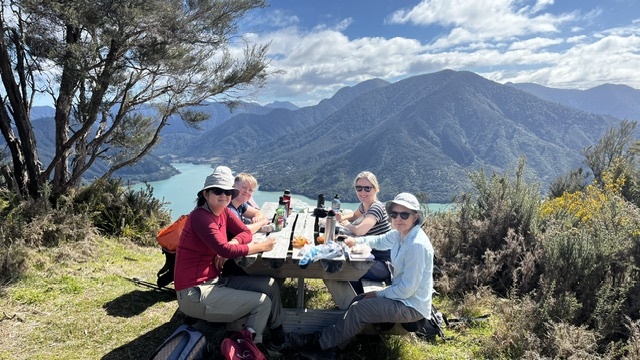 6 women trampers left Nelson at 8 am for the longish drive to Pelorus Sound and the start of the Mt Cawte Track at Moetapu Bay. It was close to 10am when we set off in warm sunny conditions.